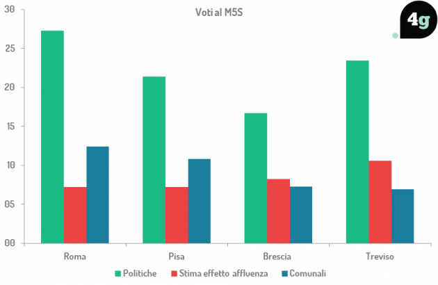 Ma allora, quanto del crollo del Movimento 5 Stelle alle Comunali è dovuto a ragioni politiche e quanto sia da associare ad altre ragioni di carattere politico? Seppur con la dovuta cautela, possiamo usare lo stesso modello avere qualche risposta. Infatti, inserendo i dati sull’affluenza alle urne delle elezioni amministrative nei comuni interessati, si riescono a stimare le preferenze che il  Movimento 5 Stelle avrebbe ottenuto alle politiche se l’affluenza fosse stata quella vista alle Comunali.  Nel grafico vediamo i casi di a Roma, Brescia, Pisa e Treviso. Il risultato è molto interessante: le stime non sono poi così lontane dai voti effettivamente ottenuti dal Movimento 5 Stelle alle Comunali.