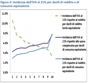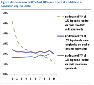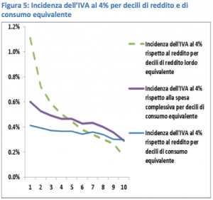 La ragione dell’incertezza dipende non soltanto dalla complicata struttura dell’imposta, ma anche da come si valuta il suo livello di redistribuzione. Ad esempio, come ha fatto notare Francesco Daveri, se la valutazione è effettuata disaggregando la spesa totale delle famiglie in quote di spesa a tassazione ordinaria, agevolata ed esente per ciascun quintile della popolazione ordinata in funzione del livello di consumo, allora l’imposta sui beni a tassazione ordinaria si configura come progressiva. Altri studi, tuttavia, hanno mostrato come in realtà l’Iva, nel suo complesso, sia un’imposta altamente regressiva se valutata rispetto al reddito.