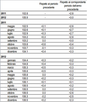 In alto troverà facilmente il dato annuale. Ad esempio, nel 2012 l’inflazione annuale in Italia è stata del 3% (ultima colonna, seconda riga): è la variazione percentuale degli indici annuali: (105.9-102.8)/102.8=0.03=3%. A loro volta, gli indici annuali sono la media degli indici mensili: ad esempio, il dato annuale 105.9 è la media dei valori assunti nei dodici mesi del 2012.