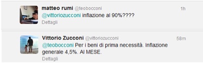 L’arma “fine di mondo” dei bislacchi Stranamore dell’informazione nostrana è sempre quella: l’inflazione! Abbiamo già commentato in questo blog un tentativo non del tutto riuscito di usarla per terrorizzare gli spettatori televisivi. Ma si sa, in televisione puoi dire quello che vuoi, il mezzo non sempre consente di tornare sulle lievi imprecisioni profferite. Nei social media, invece, le cose stanno in modo diverso, e bisogna fare un po’ più attenzione, anche se non tutti l’hanno capito. Un esempio? Gustatevi questo breve riepilogo di una conversazione su Twitter, che credo vi offrirà un sorriso: Vittorio Zucconi, direttore dell’edizione web di uno dei più autorevoli quotidiani nazionali, dimostra di non sapere cosa sia quel tasso di inflazione che però usa come spauracchio per sostenere “la causa dell’Euro”.