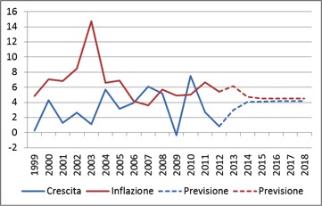 Ecco, lo vede il grafico? (Dati tratti dal WEO di aprile, fonte che lei, come me, compulsa avidamente nei momenti di tempo libero). Negli ultimi dodici anni in Brasile si è avuta inflazione a due cifre solo nel 2003. L’inflazione annua è sui valori attuali (fra il 4% e il 6%) più o meno dal 2004, e non ricordo si sia parlato di scontri di piazza. Che cosa sta succedendo adesso? Sta succedendo che la crescita ha bruscamente rallentato, e non per un solo anno, come nel 2009, ma per due anni consecutivi (2011 e 2012). Non è l’inflazione a portare la gente per strada, ma la stagnazione o recessione prolungata, caro dottor Zucconi (e in un paese emergente una crescita sotto il 2% può tranquillamente essere assimilata a stagnazione).