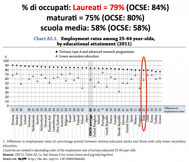 Per i laureati italiani tale maggior guadagno (+48%) non appare trascurabile, anche se negli altri paesi Ocse tende ad essere ancora maggiore (media Ocse: +57%). Non solo. Il beneficio della laurea (il cui valore legale è sempre a rischio di abolizione) emerge anche rispetto al dato occupazionale. Nell’ultimo grafico si osserva infatti la minore probabilità di disoccupazione tra chi ha in tasca un diploma di laurea e chi non lo ha. Il tasso di occupazione per i laureati italiani è pari al 79% (media Ocse:84%) contro il 75% dei maturati (media Ocse: 84%) ed il 58% per chi si è fermato alla media inferiore (media Ocse: 58%). Se da un lato, la situazione italiana è peggiore della media Ocse, il differenziale di quattro punti percentuali tra laureati e maturati è identico. Tutto il resto è, semplicemente, falso.