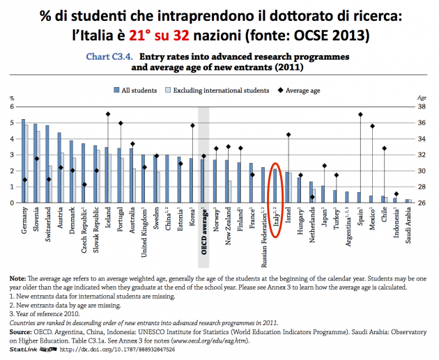 Ebbene Benedetto su Repubblica annuncia: “Ora rivedremo anche i corsi di dottorato, con criteri che porteranno a una diminuzione molto netta” (Repubblica, 4/02/2012). Ma l’assunto iniziale era corretto, ovvero l’Italia ha un numero di dottorandi tanto spropositato da doverlo ridurre? Nel seguente grafico viene riportata la percentuale di studenti che proseguono i loro studi fino al conseguimento del dottorato di ricerca. L’Italia è al di sotto della media Ocse e si colloca in 21esima posizione su 32 nazioni. Per la spiegazione delle età medie di entrata particolarmente elevate in alcune nazioni (Islanda, Spagna, Portogallo, Corea, …) si veda la discussione a p. 296 del Rapporto “Education at a Glance”.