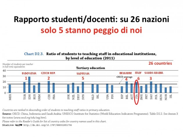 Non c’è dubbio. Ma anche qui, sbaglia. Ricorda l’ingegner Giuseppe De Nicolao, professore e analista all’università di Pavia: su 26 nazioni considerate solo 5 hanno un rapporto studenti/docenti peggiore del’Italia (Indonesia, Repubblica Ceca, Arabia Saudita, Belgio e Slovenia). Dato che Indonesia e Arabia Saudita sono paesi non-Ocse, l’Italia risulta essere quart’ultima tra i paesi Ocse per rapporto docenti/studenti. “Eppure anche questo dato, disponibile a tutti e da alcuni anni, non è mai stato utilizzato perché non funzionale come altri a dare addosso al sistema universitario. Fa parte di quel corredo di parametri sistematicamente occultato da chi guardava ai numeri del settore con gli occhiali dell’ideologia politica”.