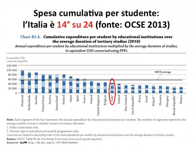 L’assunto iniziale (e quindi i rimedi finali intesi come proposte di riforma in appendice al discorso) sono falsi. “Si basano infatti sul precedente rapporto Ocse e su una rielaborazione fai-da-te del Perotti del dato sulla spesa per studente che già lo stesso rapporto indicava come inutilizzabile a fini comprativi”, spiega De Nicolao. Il rapporto mostra che la spesa media per studente lungo la durata media del suo corso di studi, lungi dall’essere la quarta al mondo, è invece 14-esima con un valore pari al 75% della media Ocse”. In altre parole il sistema universitario italiano non è quella babele di sprechi e costi ingiustificati che si vuol sempre rappresentare nel dibattito pubblico. O almeno, l’Italia (almeno in questo) non è la pecora nera d’Europa.