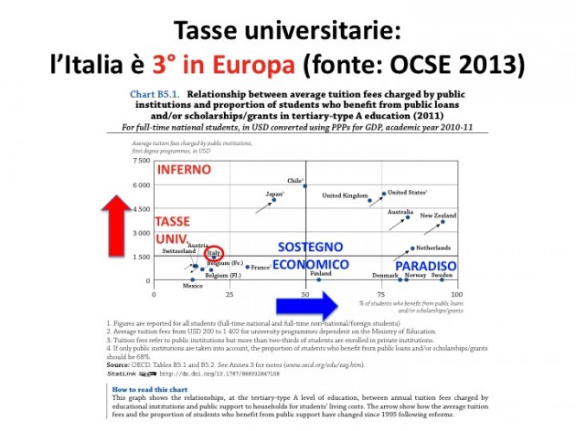 Tutta la verità sull’università italiana, ovvero: come ti sbugiardo dieci anni di proclami (e programmi) politici che hanno fatto del luogo comune e dell’analisi falsata il grimaldello per entrare nel sistema dell’istruzione e giustificarne la progressiva demolizione, dalle guerre sante dei berluscones contro la scuola pubblica agli strali dei “professori” chiamati da Monti a tagliare la spesa statale per l’istruzione. “Abbiamo troppi laureati”, no troppi professori, l’università pubblica “costa troppo”, la laurea “non vale nulla”… Tutte clamorosissime “balle”, e lo certifica l’Ocse che ha appena diffuso l’edizione 2013 del suo Rapporto sullo stato dell’istruzione a livello mondiale (scarica). Si parla anche dell’Italia, eccome. Numeri su numeri, statistiche comparative tra nazioni su spesa, costi privati, quantità di professori, studenti, laureati e dottorandi. E ancora, analisi su benefici e costi socioeconomici dell’istruzione universitaria e del valore del titolo accademico.