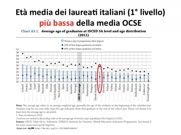Anche questo non è vero, a insistere sullo stesso punto è però l’ex sottosegretario Michel Martone (quello che laurearsi dopo i 28 anni “è da sfigati”), su Repubblica: “Il problema dell’età media dei laureati in Italia esiste”. L’Ocse dice esattamente il contrario: l’età media dei laureati italiani è addirittura più bassa della media europea. In realtà il mancato rispetto dei tempo nominali è un fenomeno diffuso a livello mondiale, mentre nelle dichiarazioni degli “esperti” viene propagandato come il piccolo e imperdonabile vezzo di un Paese che tira a campare, azzoppato dal carrozzone universitario, mentre l’Europa e il mondo corrono.