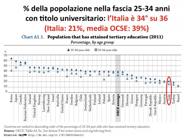 Ed ecco che sul sito de Lavoce.info, l’esperto getta il sasso nello stagno al motto “Siamo davvero sicuri che questo Paese abbia bisogno di più laureati?” (28/11/2012). Ma ha ragione Giavazzi, sono davvero troppi gli studenti dell’università italiana? Niente affatto e l’Ocse lo certifica. Come percentuale di laureati nella fascia più giovane (25-34 anni) l’Italia è all’ultimo posto in Europa (21% contro 39% della media Ocse). Se si considera che il Brasile è una nazione non-Ocse, l’Italia è al penultimo posto tra i Paesi Ocse dato che solo la Turchia (19%) ha meno laureati di noi. Sarà allora che abbiamo troppi docenti.