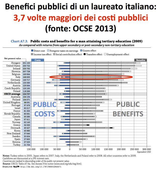 La questione viene analizzata in dettaglio dall’Ocse che sfata l’ennesimo falso mito: i benefici sociali conseguenti da un laureato italiano maschio sono 3,7 volte maggiori dei costi pubblici (media Ocse: 3,9), nel caso di una laureata femmina sono 2,4 volte maggiori (media Ocse: 3,0). Quindi un euro speso in ricerca ne porta da 2,4 a 3,7.