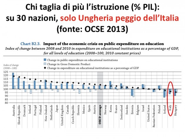 L’esatto contrario della Gelmini: ad eccezione di Repubblica Slovacca e Ungheria, l’Italia spende meno di tutte le altre nazioni europee (61% della media Ocse, 69% della media Eu21). Mentre la maggior parte delle altre nazioni hanno riconosciuto la natura strategica delle spese per istruzione, l’Italia, con la sola eccezione dell’Ungheria, è la nazione che ha effettuato i tagli più pesanti (il rapporto Ocse non fornisce il dato relativo alla sola spesa per università, ma un dato aggregato relativo all’intera spesa per istruzione). Se si considera la percentuale della spesa pubblica destinata all’istruzione, si scopre che l’Italia è ultima su 32 nazioni. Insomma, Gelmini bocciata su tutta la linea.