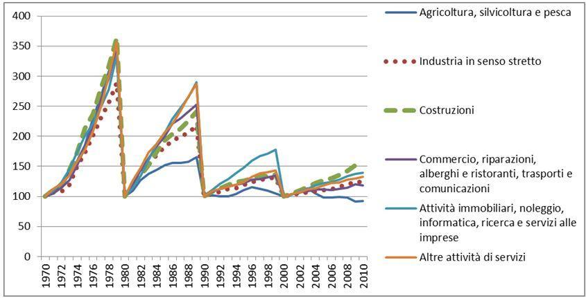 (4) Il deflatore del valore aggiunto settoriale, come il deflatore del Pil, è dato dal rapporto tra il valore aggiunto a prezzi correnti e il valore aggiunto a prezzi costanti di un anno base. Nei grafici i deflatori sono costruiti con numeri indici del valore aggiunto a prezzo costanti (prezzi 2000), e numeri indici del valore aggiunto di ciascun settore a prezzi correnti, con base 1970=100 nel primo grafico, e con base all’anno iniziale di ciascun decennio nel secondo grafico.