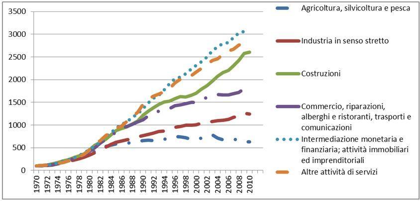 Grafico 3 – Deflatore del valore aggiunto per settori (base 1970=100)