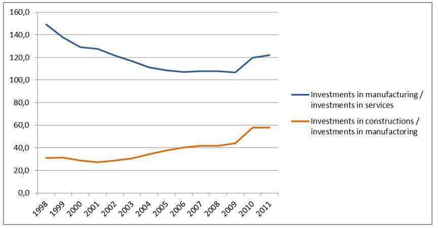 Durante la bolla speculativa, il rapporto tra impieghi bancari nel settore delle costruzioni e impieghi nel settore manifatturiero cresce continuamente: gli impieghi in edilizia giungono a pesare il 60 per cento degli impieghi nel manifatturiero, che si riducono anche rispetto all’investimento nei servizi (grafico 5). (6) Poiché l’edilizia ha una produttività media comunque inferiore a quella manifatturiera, il processo ha ridotto la produttività aggregata della nostra economia.