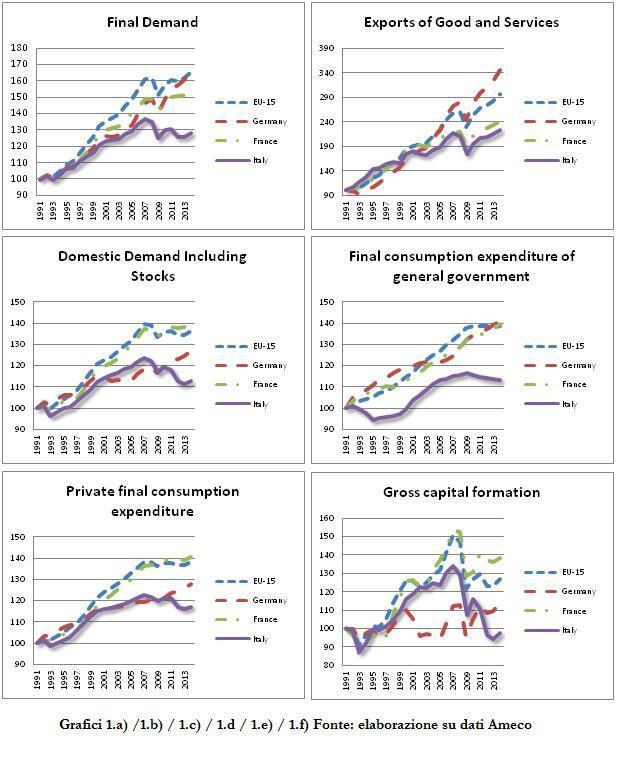 Il grafico 1.a) mostra come la domanda finale, dal 1991 in poi, è molto più debole in Italia rispetto alla media europea e alla Francia e alla Germania. In particolare da inizio anni duemila il divario cresce costantemente, segno che nell’ultimo decennio vi è stata una totale penalizzazione di qualsiasi tipo di politica keynesiana. Tutte le componenti della domanda aggregata fanno registrare dati sconcertanti. Le esportazioni 1.b), le quali seppur seguono l’andamento francese sino al 2007, si trovano ben al di sotto della media europea mentre domanda domestica 1c) e spese di consumo finale del governo 1d),sono totalmente fuori dalla media.