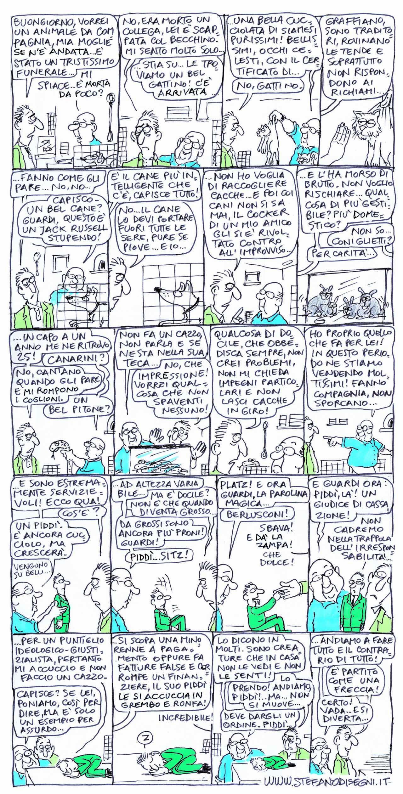 Un uomo, rimasto vedovo, cerca un animale da compagnia. Niente gatti, cani, canarini, coniglietti e pitoni: quel che vuole è “qualcosa di docile, che obbedisca sempre, non crei problemi e non chieda impegni particolari”. Il venditore, allora, gli propone “un Piddì, ancora cucciolo”.
