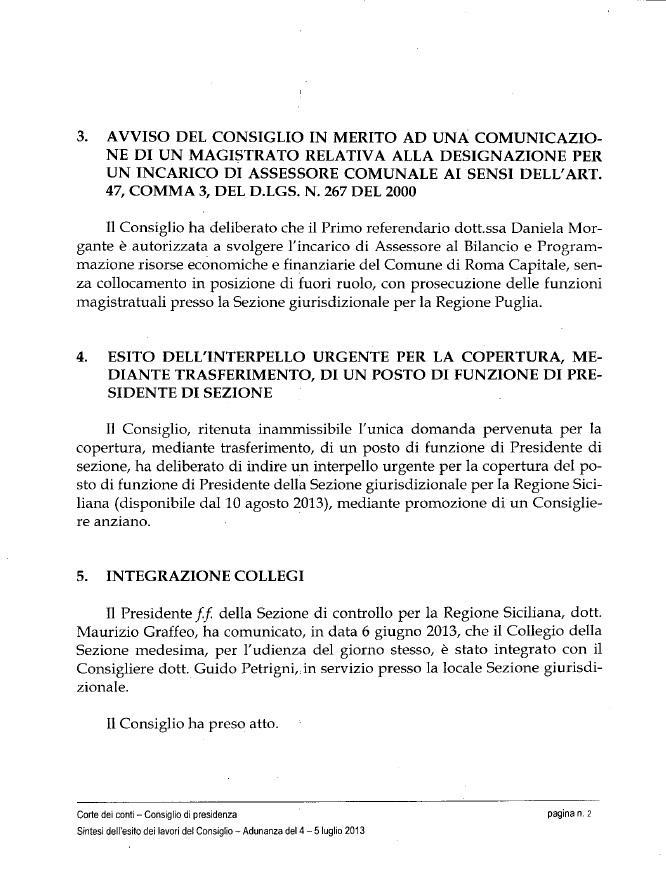 Resta il fatto che Morgante guadagna due stipendi pubblici. E, sotto il profilo formale, è la stessa Corte dei Conti ad autorizzare questo doppio incarico senza aspettativa (leggi il documento). Il punto però – al di là delle incompatibilità formali e dello Statuto capitolino – è l’opportunità politica. È opportuno che un giudice contabile, impegnato in Puglia nelle funzioni di controllo della spesa pubblica, al tempo stesso metta mano al bilancio di una città, tra i più corposi e complessi del Paese? Soldi pubblici, soprattutto, soggetti al controllo dei colleghi laziali – quelli togati, s’intende – di Morgante.