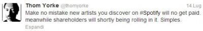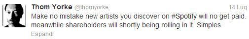 Non la pensa in questo modo Thom Yorke. Proprio in questi giorni il leader dei Radiohead ha manifestato il proprio dissenso; tramite twitter ha lanciato un messaggio inequivocabile: “Make no mistake new artists you discover on #Spotify will no get paid. meanwhile shareholders will shortly being rolling in it. Simplex”.