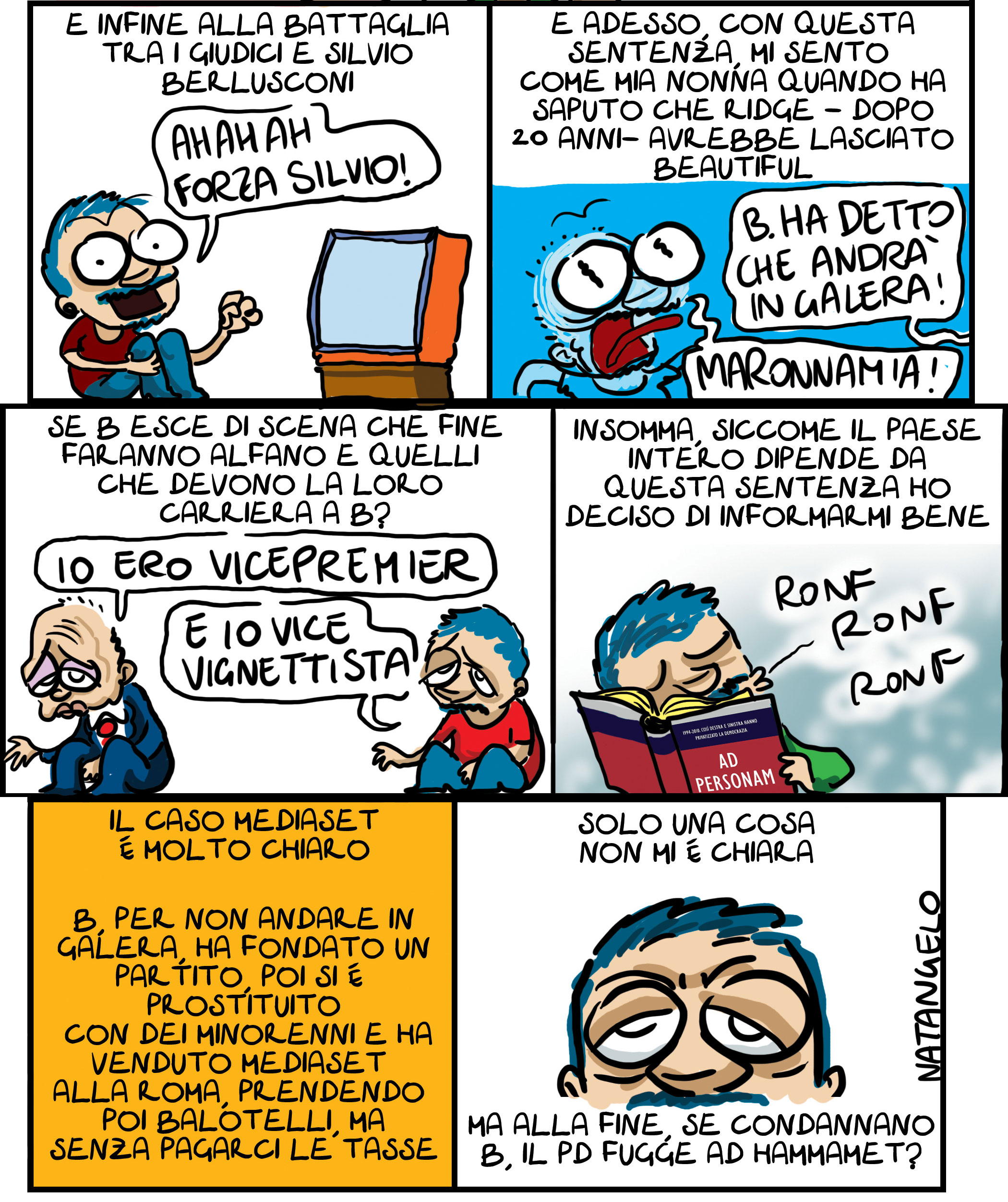 La ‘sentenza del secolo’ è in arrivo e il paese è fermo, in attesa del verdetto della Cassazione: i giudici confermeranno la condanna a quattro anni di carcere e cinque di interdizione dai pubblici uffici per B? E se così fosse cosa ne sarà del gorvenino Letta? Dell’auspicata ripresa economica? Cosa resterà del Pd? E, ancora, cosa resterà – parafrasando la nota canzone – di questi anni di Berlusconismo?