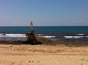 Quali sono le conseguenze del ripascimento? Studi americani hanno dimostrato che l’erosione delle spiagge ‘ritoccate’ è due o tre volte più veloce rispetto a quelle ‘vergini’. Inoltre, questa attività è molto costosa e deve essere ripetuta periodicamente. Infine, viene alterato l’equilibrio biologico della costa. I bulldozer che si muovono sulla sabbia ne modificano la struttura e la consistenza disgregandone la compattezza e distruggendo tutti i principi nutritivi che attirano la vita marina. Se non c’è cibo, un volatile cambia costa.ruspe al lavoro nella spiaggia di Cornino, Trapani