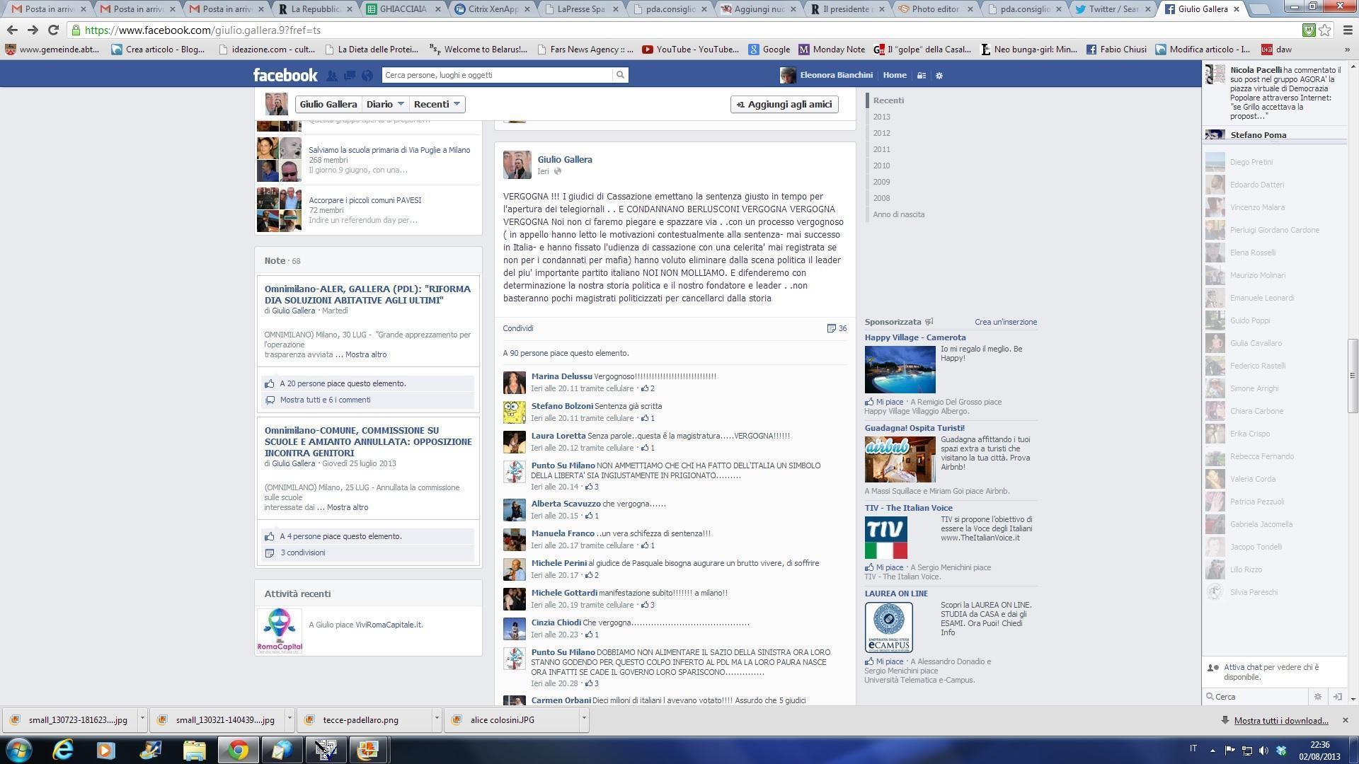 I due commenti compaiono sulla pagina del social network del consigliere regionale del Pdl Giulio Gallera (leggi) che in uno status scrive: “Vergogna! I giudici di Cassazione emettano la sentenza giusto in tempo per l’apertura dei telegiornali. E condannano Berlusconi (…) Noi non ci faremo piegare e spazzare via. Con un processo vergognoso ( in appello hanno letto le motivazioni contestualmente alla sentenza- mai successo in Italia – e hanno fissato l’udienza di cassazione con una celerità mai registrata se non per i condannati per mafia) hanno voluto eliminare dalla scena politica il leader del più importante partito italiano. Noi non molliamo – conclude -. E difenderemo con determinazione la nostra storia politica e il nostro fondatore e leader. Non basteranno pochi magistrati politicizzati per cancellarci dalla storia”.
