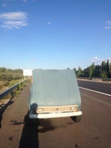 Dopo i primi 100 chilometri, più o meno all’altezza di Cannes ecco il vero colpo di scena. La spia rossa della temperatura dell’acqua prima comincia a lampeggiare, poi diventa fissa e s’illumina d’immenso. Pietro, affettando una certa esperienza, raggiunge il primo autogrill e inizia un’ispezione al motore. Accorre un altro guidatore che si dichiara appassionato di meccanica, nonché nostalgico dei motori di una volta, e comincia un consulto in diretta. Nel suo serbatoio il liquido di raffreddamento ribolle come le rapide del Fiume Rosso. Potrebbe essere questo il problema, il guidatore appassionato di meccanica però non è convinto, e sospetta invece della ventola. “Il bulbo del radiatore passa il contatto, ma lei non gira”. Pietro si ricorda che una volta c’era una cinghia ad azionarla, ma ora è tutto elettrico, e il mistero si infittisce. “E comunque, state attenti, perché così si rischia di fondere la testata”.