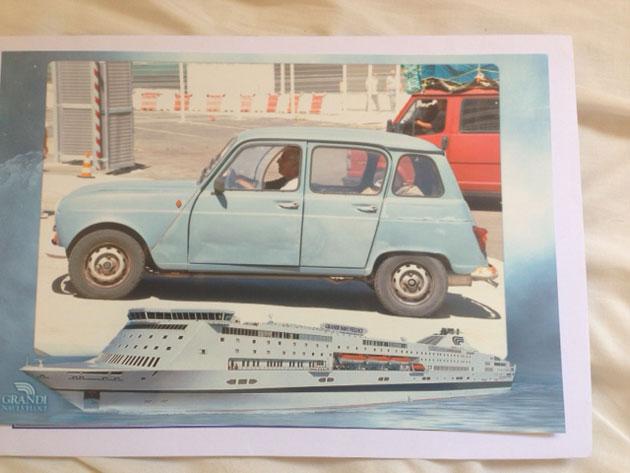 Mercoledì 23 agosto (terzo giorno). Con la Rabmobile in condizioni sempre più preoccupanti -ora fatica anche a tenere il minimo, che stia meditando il suicidio?- ci apprestiamo a traghettare dal porto di Sète. Tra mille sussulti, l’eroica Renault varca l’ingresso del garage attorno alle 13.30 (in quel momento fatale verrà immortalata dal fotografo di bordo, come si vede nella foto qui sotto). La motonave batte bandiera tricolore. Grandi Navi Veloci. Beh, insomma. A Roma dicono nun te allargà. Nella sostanza, poco più di un cargo che se la tira da nave da crociera (se ci vedete una metafora, fate pure). La sala poltrone Zaphire sarebbe più giusto chiamarla Zapphere (come zaffata). Unica attrazione prevista “la serata di musica marocchina”: un cantante che semina il terrore tra i bambini, costringendo tutti a ritirarsi sottocoperta;