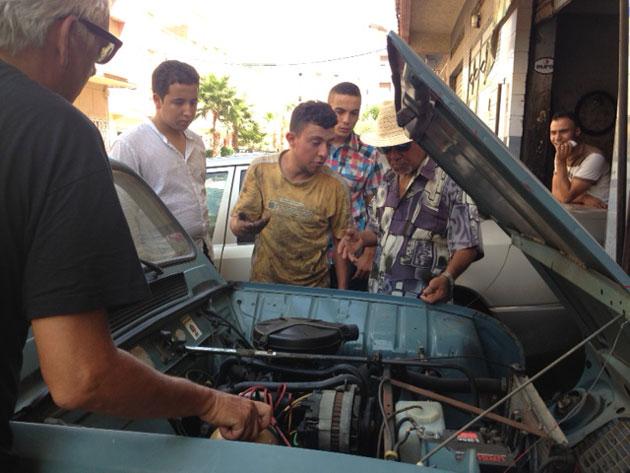 Venerdì 25 agosto (quinto giorno). L’Hotel Marbella di Nador è uno di quei posti in cui se il destino ti dà appuntamento lì, ti verrebbe voglia di dirgli due paroline in privato. Uno di quei posti che si lasciano un po’ provati ma con il cuore pieno di felicità, perché siamo certi che quella è l’ultima volta nella vita che li vediamo. Se questo è uno dei migliori indirizzi della città, meglio cambiare indirizzo. Anzi, meglio cambiare città. Già, ma con quale mezzo? Ci aggiriamo di buon’ora per il boulevard che dalla passeggiata a mare porta verso il suk schivando i montarozzi di rifiuti (una sola, grande raccolta indifferenziata) piuttosto sfiduciati. Siamo convinti che solo un mezzo miracolo ci possa salvare. Ma a sorpresa, il primo meccanico marocchino interpellato si dichiara ottimista; dopo un animato conciliabolo in arabo stretto, il suo interprete in francese assicura “Lasciategli la macchina e in capo a due ore tutto sarà risolto.” Cerchiamo di capire come, invano. Sarà un trucco per spillarci qualche euro oppure saprà davvero il fatto suo?