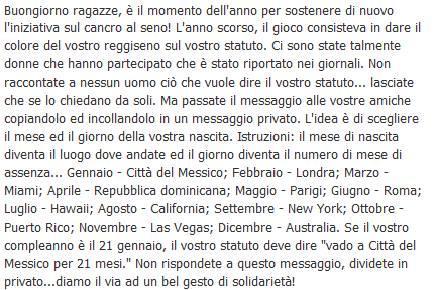 Sia chiaro: liberi tutti. Se per un quarto d’ora di presenza mediatica si vuole pubblicare sulla bacheca Facebook il colore del reggiseno (l’anno scorso) oppure il mese di nascita e una località calcolata non si sa bene come, a me sta bene. Ma non illudiamoci che serva per sensibilizzare nei confronti del tumore al seno.
