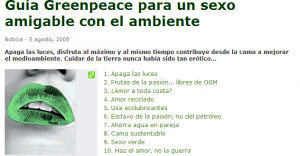 Siamo un popolo di ambientalisti: andiamo in bici, mangiamo biologico, facciamo eco-sesso. Per chi vuole provare l’ebrezza del ‘piacere’ a km zero e godere senza distruggere la foresta Amazzonica, Greenpeace ha stilato un decalogo con dieci regole sul “sesso ecologico”. Premessa: il binomio sesso-regola a me fa venire un’orticaria pigmentosa; se anche a letto mi devo contenere (scusa caro, cambiamo posizione, così stiamo uccidendo un Ficus Sycomorus del Madagscar), preferisco la castità, forse.