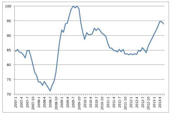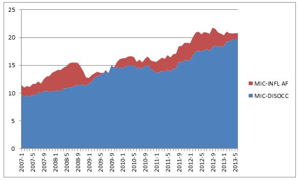 La figura 1 mostra l’andamento del disagio sociale in Italia da gennaio 2007 a giugno 2013 scomposto nei contributi dati dalle due componenti (in rosso l’inflazione dei beni e servizi ad alta frequenza d’acquisto e in blu la disoccupazione estesa). Dal grafico emerge che negli ultimi cinque anni il disagio sociale è cresciuto enormemente.