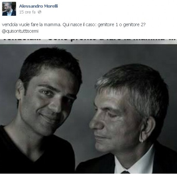 Nella stessa immagine veniva riportata anche la frase, attribuita a Nichi Vendola: “Sono pronto a fare la mamma”. La foto postata sul profilo di Morelli è condita da un’altra scritta, che recita: “No alle adozioni per i gay”. Nel testo del post con cui Morelli commentava la foto pubblicata, invece, veniva formulata una battuta sarcastica: “Vendola vuole fare la mamma. Qui nasce il caso: genitore 1 o genitore 2?”.
