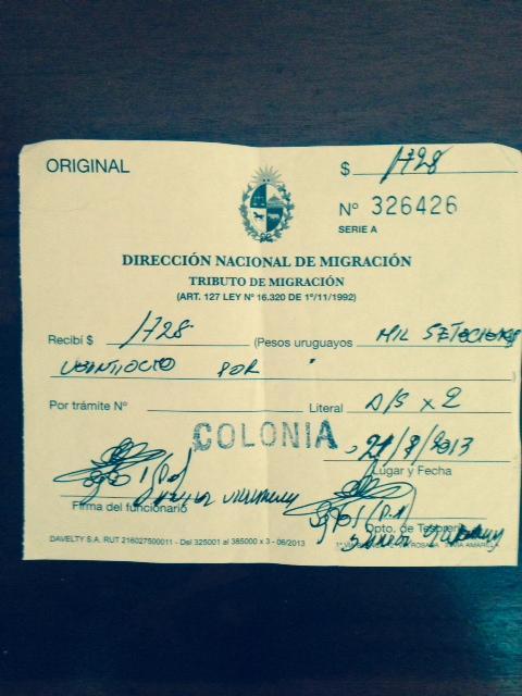 Si dorme poco all’Hotel Sol, e non è colpa del russare del vicino che è sempre più verde. Il telefonino di Pedro è spento, d’altra parte in Portogallo è notte fonda, ma resta muto anche quando diventa notte fonda in Uruguay, e poi mattina, senza che nulla accada. Verso mezzogiorno, Pietro frigge all’idea che in quel momento la Rabmobile è a Buenos Aires in cerca del suo padrone e decide di andare in avanscoperta alla stazione, costi quel che costi. Ma proprio in quel momento (o quasi: lasciateci romanzare un po’) due agenti di polizia appaiono nella hall. Cercano di noi. Sono venuti a prenderci e a scortarci a un altro ufficio della Stazione Marittima, dove ci attende un altro funzionario (e un po’ ce l’aspettavamo, perché anche questo ormai è chiaro: quaggiù le cose non si ripetono mai uguali). Il nuovo funzionario è basso, tarchiato e coi baffi. Sembra un po’ Maurizio Costanzo. L’aspetto non promette nulla di buono, invece ha buone notizie; dobbiamo pagare una multa per riavere il visto di ingresso e potremo avere quello di uscita e ripartire anche subito, se lo vogliamo. Certo che lo vogliamo! Ci precipitiamo a cambiare i 1728 pesos urugayani dovuti, paghiamo e con la ricevuta della multa in mano (foto 1) siamo in tempo a prendere il traghetto delle 15.30.
