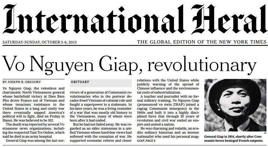 Oggi, 5 ottobre, International Herald Tribune si apre con un “obituary”, un necrologio a sei colonne, con fotografia e titolo: “Vo Nguyen Giap, un rivoluzionario”.