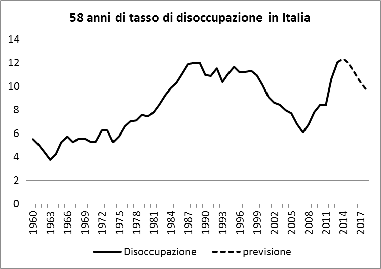 Caso vuole che in questo periodo del semestre debba parlare nel mio corso dei fallimenti del mercato, fra i quali si annovera la disoccupazione. E così, quando ho mostrato questo grafico in classe, i miei studenti non ci potevano credere: “Ma come! Ma negli anni ’70 la disoccupazione non era a due cifre!? Ma se le cose stanno così, bisogna scrivere ai giornali, bisogna chiedere di rettificare…”.