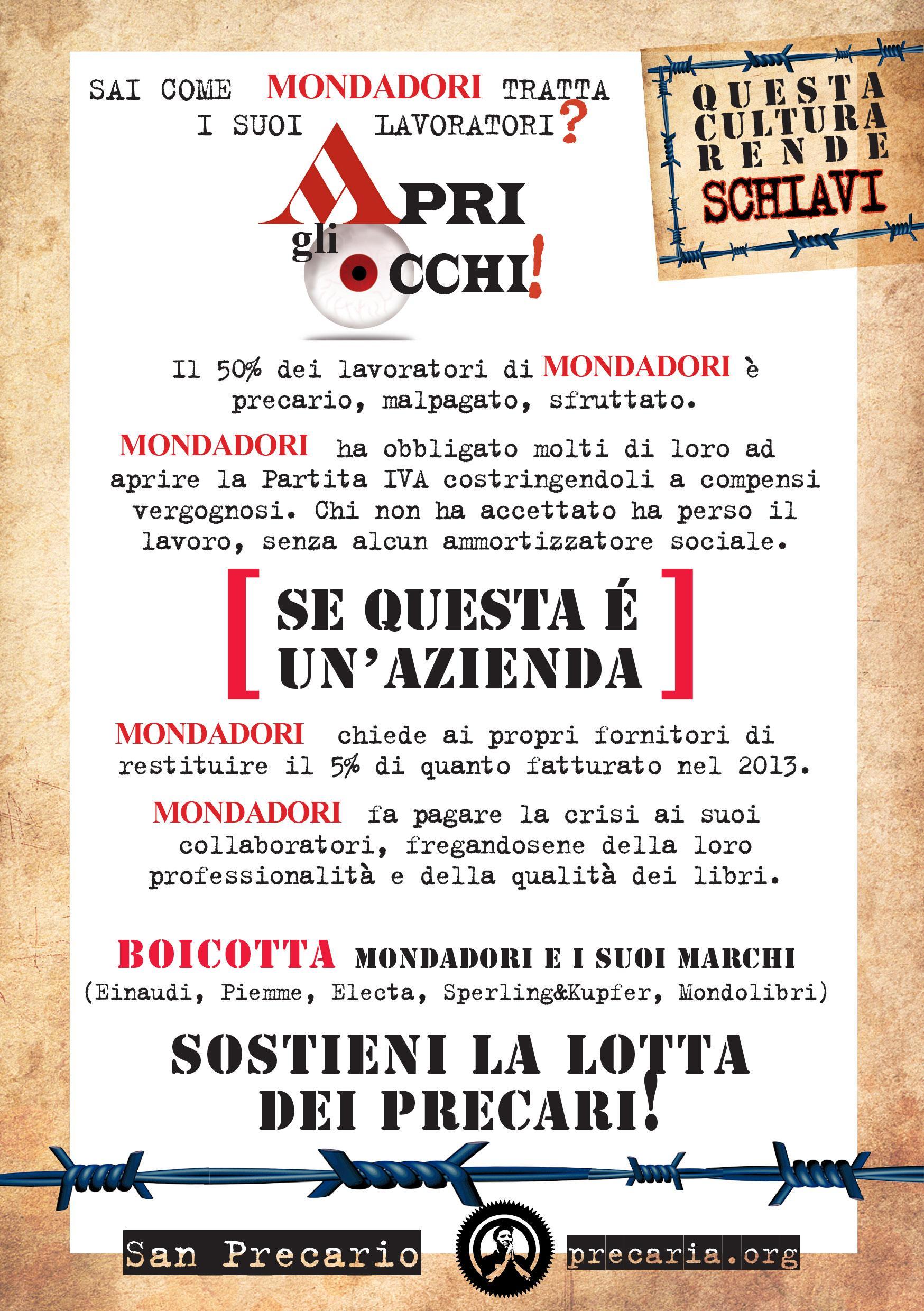 “Sai come Mondadori tratta i suoi lavoratori? Il 50% dei lavoratori di Mondadori è precario, malpagato, sfruttato. Mondadori fa pagare la crisi ai suoi collaboratori, fregandosene della loro professionalità e della qualità dei libri. Se questa è un’azienda.”