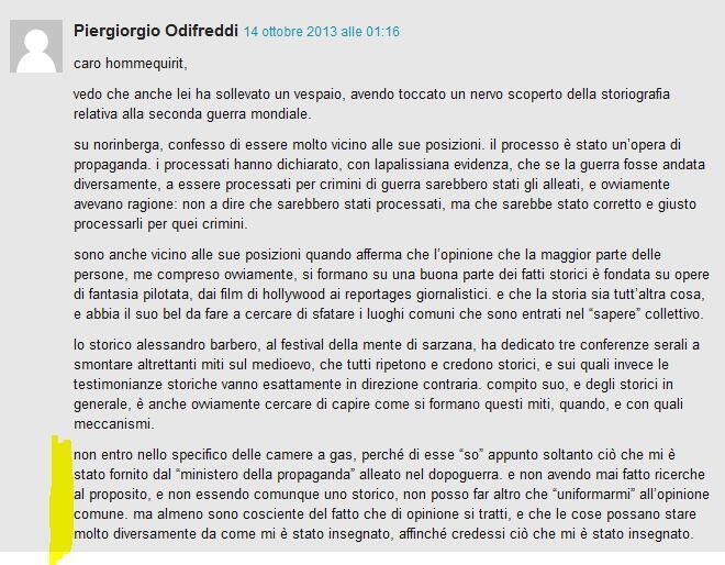 Ma da quanto è possibile ricostruire dalla ragnatela dei messaggi sui social network, sembra che sia stata soprattutto la risposta che ha dato a un lettore a scatenare i commenti successivi. Il matematico, toccando l’argomento dei “miti storici”, afferma di essere “vicino” alle posizioni del suo interlocutore su Norimberga quando afferma: “Il processo è stata un’opera di propaganda”. Quindi conclude così: “Non entro nello specifico delle camere a gas, perché di esse ‘so appunto soltanto ciò che mi è stato fornito dal ‘ministero della propaganda’ alleato nel dopoguerra, e non avendo mai fatto ricerche, e non essendo uno storico, non posso fare altro che ‘uniformarmi’ all’opinione comune; ma almeno sono cosciente del fatto che di opinione si tratti, e che le cose possano stare molto diversamente da come mi è stato insegnato” (leggi).