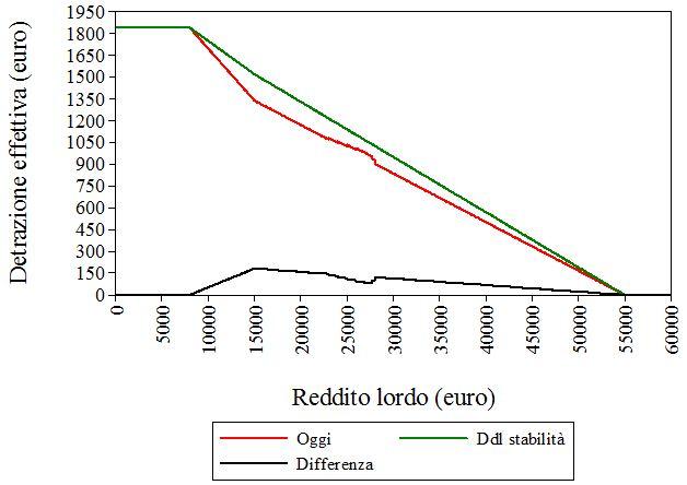 La bozza della Legge di stabilità per il 2014 presenta due novità che riguardano l’Irpef: l’aumento della detrazione sui redditi da lavoro dipendente e una possibile razionalizzazione delle detrazioni su alcune spese (spese mediche, per istruzione, funebri, eccetera). Cominciamo dalla detrazione per fonte di reddito, che aumenta (figura 1) per tutti i lavoratori dipendenti non incapienti con reddito tra 8 e 55mila euro, mentre rimane invariata per i pensionati, gli autonomi e i dipendenti incapienti o con reddito superiore a 55mila euro. (1) Come nell’attuale normativa, la decrescenza della detrazione rimane differenziata per i redditi compresi tra 8 e 15mila euro e tra 15 e 55mila euro. Tuttavia, come si nota dalla figura 1, la decrescenza proposta nel disegno di Legge di stabilità è pressoché lineare. Inoltre, sono abolite le “micro-detrazioni” aggiuntive di poche decine di euro al massimo che la normativa Irpef prevede per i lavoratori dipendenti con reddito compreso tra 23 e 28mila euro. L’aumento della detrazione è crescente tra gli 8 e i 15mila euro (il massimo è pari a 182 euro), mentre diminuisce successivamente (figura 1, linea nera).
