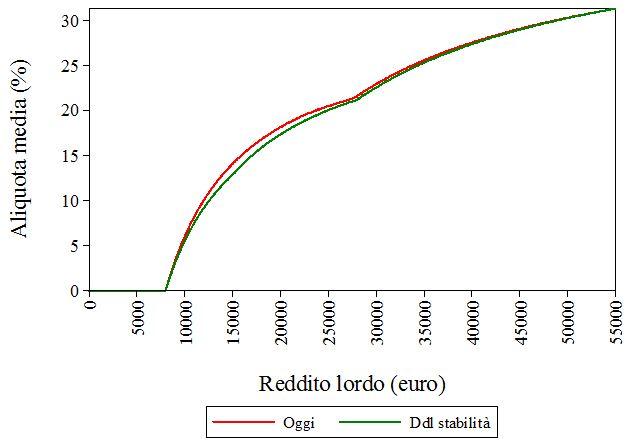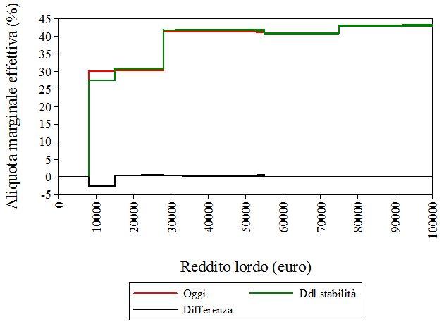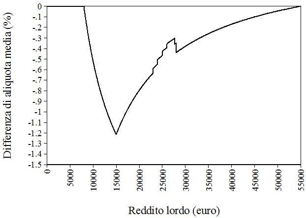 Dal punto di vista tecnico, le modifiche comportano un effetto positivo per i redditi compresi tra 8 e 15mila euro: per questa fascia di reddito l’aliquota marginale effettiva (cioè la variazione di imposta netta dovuta a un aumento del reddito) si riduce del 2,6 per cento, passando dall’attuale 30,17 per cento (si noti che l’aliquota marginale legale è pari al 23 per cento) al 27,57 per cento (figura 2). Rimane invece sostanzialmente invariata nelle altre fasce di reddito: un po’ superiore al 30 per cento nella fascia 15-28mila euro, per poi salire sopra il 41 per cento superata tale soglia (43 per cento oltre i 75mila euro). (2) La figura 3 confronta invece l’aliquota media nei due scenari, mentre la figura 4 ne evidenzia la differenza. I redditi attorno a 15mila euro beneficiano della maggiore riduzione dell’incidenza media (-1,2 per cento). Le irregolarità della riduzione tra i 23 e i 28mila euro dipendono dall’eliminazione delle citate “micro-detrazioni”.