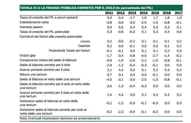 Il problema in verità è ancora più complicato perché anche la Legge di stabilità presentata dal Governo potrebbe essere incostituzionale. Infatti, lo scenario macroeconomico descritto dal Governo per il 2014, prevede, come si ricordava, un disavanzo pari al 2,5 per cento, mentre il disavanzo a legislazione vigente e che si otterrebbe senza Legge di stabilità è pari al 2,4 percento. Questo significa che, rispetto allo scenario a bocce ferme, la Legge di stabilità peggiora il disavanzo di 0,1. Ed è proprio questo 0,1 per cento che ci allontana dal bilancio strutturalmente in pareggio. Come si vede dalla tabella qui sotto, tratta dalla Nota di aggiornamento del Documento di Economia e Finanza, in assenza della manovra, il bilancio 2014 sarebbe strutturalmente in pareggio. Non ci stupirebbe se – tra qualche mese – la Corte Costituzionale annullasse la Legge di stabilità approvata dal Parlamento. Un paradosso per il Governo del Presidente. Il Governo può forse sperare che una deviazione relativamente limitata dal sentiero di avvicinamento del bilancio in pareggio passi inosservata, dato anche che il Fiscal Council ancora non esiste. Ma la sostanza è un’altra: o le regole di bilancio ci sono e vanno rispettate, oppure meglio cambiarle o spostarne apertamente nel tempo l’entrata in vigore e concederci maggiori margini di manovra per il taglio delle tasse.