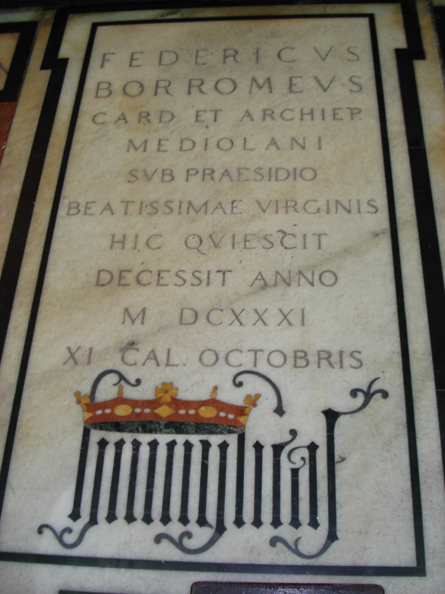 Il 21 settembre 1631 il Cardinale Federico Borromeo morì, dopo una lunga febbre. Il suo corpo, imbalsamato e coperto di fiori, rimase esposto per tre giorni nella cappella dell’arcivescovado. Il cuore e l’intestino furono racchiusi dentro un vaso d’argento. Milano lo celebrò per tre giorni. Paolo Aresi, che recitò l’orazione funebre commentò: “E’ morto con il crocefisso in una mano e la penna nell’altra”. Di lui scriverà Alessandro Manzoni: “Fu degli uomini rari in qualunque tempo, che abbiano impiegato un ingegno egregio (…), un intento continuo, nella ricerca e nell’esercizio del meglio”.