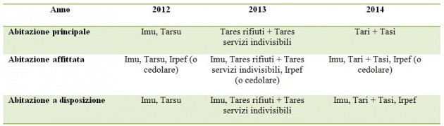 Nel 2012 il decreto salva-Italia introduce l’Imu che, rispetto alla precedente Ici, sottopone a imposizione (in modo assai più pesante) tutte le abitazioni, anche le prime case. Sempre su tutte le abitazioni si paga la “tassa” sui rifiuti allora denominata Tarsu. Per le abitazioni cedute in locazione, i canoni percepiti vengono sottoposti a Irpef (a o cedolare secca), mentre le seconde case a disposizione non pagano alcuna imposta sui redditi.