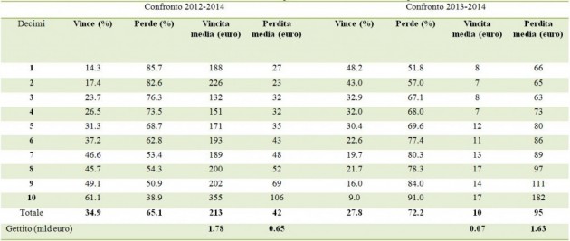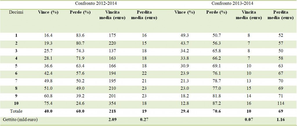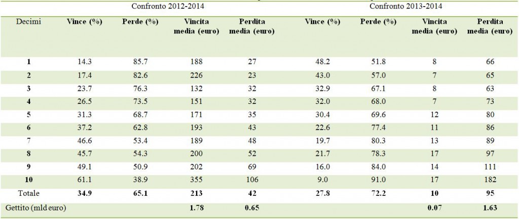 Confrontando infine quanto succede tra il 2013 e il 2014, si osserva che il 27,8 per cento delle famiglie ottiene un beneficio medio pari a 10 euro (in aggregato pari a 0,07 miliardi), mentre il 72,2 per cento subisce una perdita pari a 95 euro in media (in aggregato pari a 1,63 miliardi). L’aumento complessivo di gettito è 1,57 miliardi.