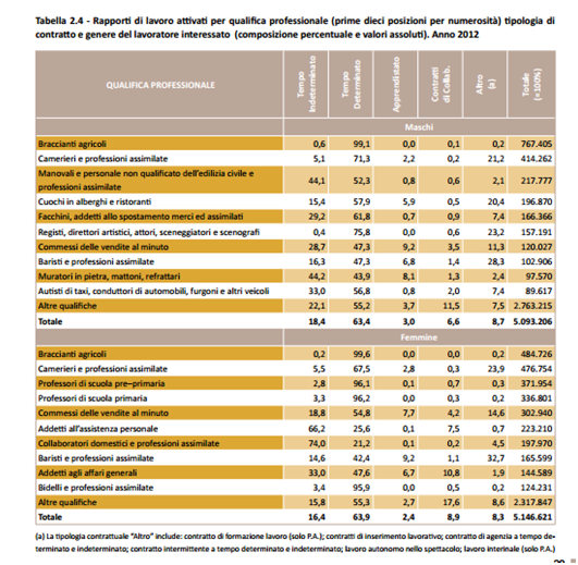 Quindi tutta questa disponibilità di posti nel privato non c’è. Chiarito questo tocca capire se potranno però ricavarsi un posticino, riciclarsi in quel poco che c’è, infondo sono laureati con esperienza di livello. Ma dove? Chi sono gli assunti di cui parla Ichino? “Tra gli uomini assunti a tempo indeterminato nel 2012, il 20% è composto da manovali edili, facchini e muratori. Tra le donne il 35% (294 mila) sono addette all’assistenza personale e collaboratrici domestiche. Seguono camerieri, baristi, cuochi, bidelli*. Da qui la battuta “Elaboro statistiche per il Ministero, posso andare a fare la badante da Ichino?”.