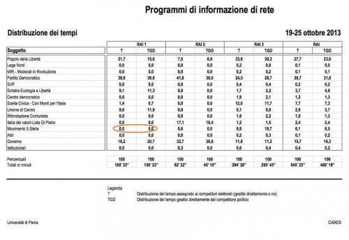 Nel periodo esaminato che va dal 19 al 25 ottobre possiamo vedere che il Pdl ha avuto nel complesso uno spazio di circa il 30% sulle reti Rai; il Pd fra Rai1 e Rai2 uno spazio vicino al 40%; il Movimento 5 stelle una media del 6% con una presenza su Rai 1 pensate dello 0,0%.