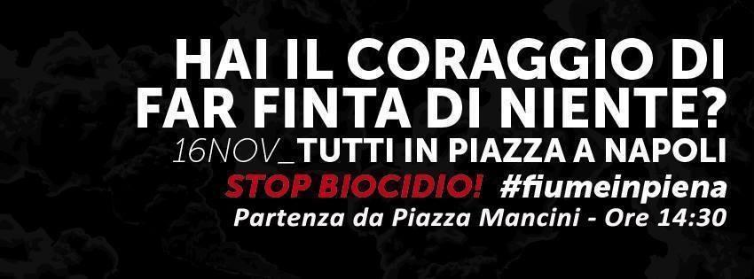 “È un fatto – si legge sul sito di www.fiumeinpiena.it – che in Campania le aspettative di vita siano più basse che nel resto dell’Italia. È un fatto che i casi di tumore siano in costante aumento. Ed è un fatto che ogni notte, nella Terra dei Fuochi, vengano dati alle fiamme copertoni e residui industriali. È un fatto che a Caivano, dopo gli scavi della Guardia Forestale, siano stati ritrovati bidoni di materiale tossico, fusti di metalli e residui industriali. Non è populismo, non è vittimismo; non è nemmeno disfattismo. Sono, lo ripetiamo, fatti. Ed è in virtù di questi fatti – di questi ed altri cento, mille, diecimila fatti – che il 16 Novembre scenderemo in piazza”.