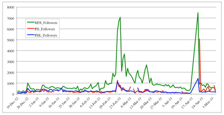 Le elezioni politiche del febbraio 2013 sono state segnate dal successo, inatteso in queste proporzioni, del Movimento 5 Stelle. Il sistema partitico italiano è stato scosso dal risultato: in risposta all’exploit di un movimento fondato, organizzato e gestito in rete, gli altri partiti hanno sensibilmente accelerato il processo di integrazione delle loro strategie di comunicazione online, divenendo più presenti e attivi nei social network, in particolare suTwitter.