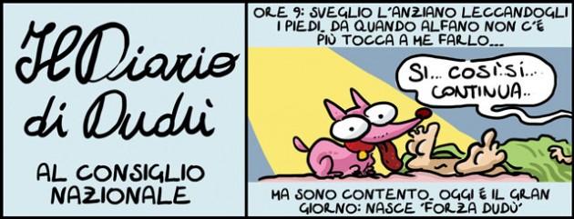 Sabato scorso, a Roma, si è tenuto il Consiglio nazionale del Pdl che ha sancito la separazione tra Alfano e B e la rinascita di Forza italia. Qualcuno ha detto ‘mancava solo Dudù’. Dudù invece ‘era, ed ecco il suo diario di quella giornata emozionante (la prima puntata del diario di Dudù la trovate – animata – qui).