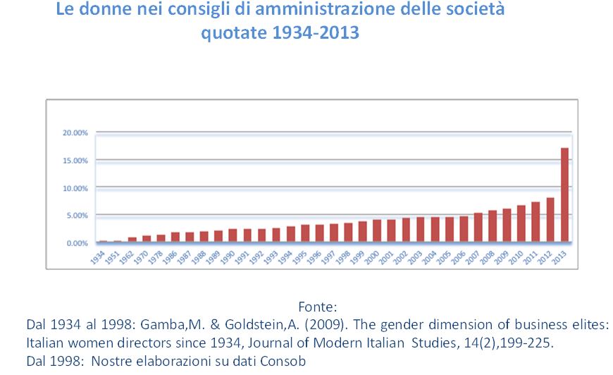 Si tratta di una vera rivoluzione per le società italiane. La presenza di donne nei consigli di amministrazione delle società quotate è sempre stata molto bassa, ben al di sotto del 7 per cento fino al 2011, circa un terzo di quella di paesi come la Finlandia (27 per cento), la Svezia (25 per cento) e la Francia (22 per cento). (1)