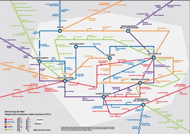Su questi temi, sintetizzando le ricerche dei maggiori istituti internazionali che si occupano di futuro, abbiamo “disegnato” una mappa, una sorta di guida per orientarsi e per capire cosa si prevede. Ne viene fuori uno scenario molto articolato, con indicazioni anche di verso contrastante, dove accanto ad una decina di macrotendenze (ossia: processi forti e persistenti nel tempo) emergono una serie tendenze in atto e presumibilmente perduranti nei prossimi anni e alcune previsioni di scenari che potrebbero concretizzarsi dopo il 2020.