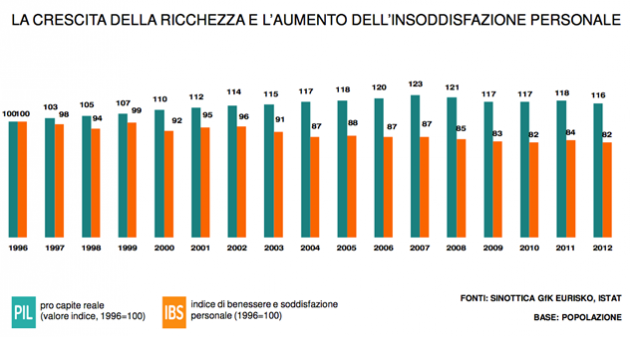 Se si guarda poi questa tabella fatta da Eurisko si nota che non c’è relazione tra prodotto interno lordo pro-capite e benessere personale. Dal 1996 in poi, il benessere, lo star bene, la soddisfazione per la propria vita continua a scendere, mentre il Pil cresce fino al 2006 e poi scende negli ultimi anni.
